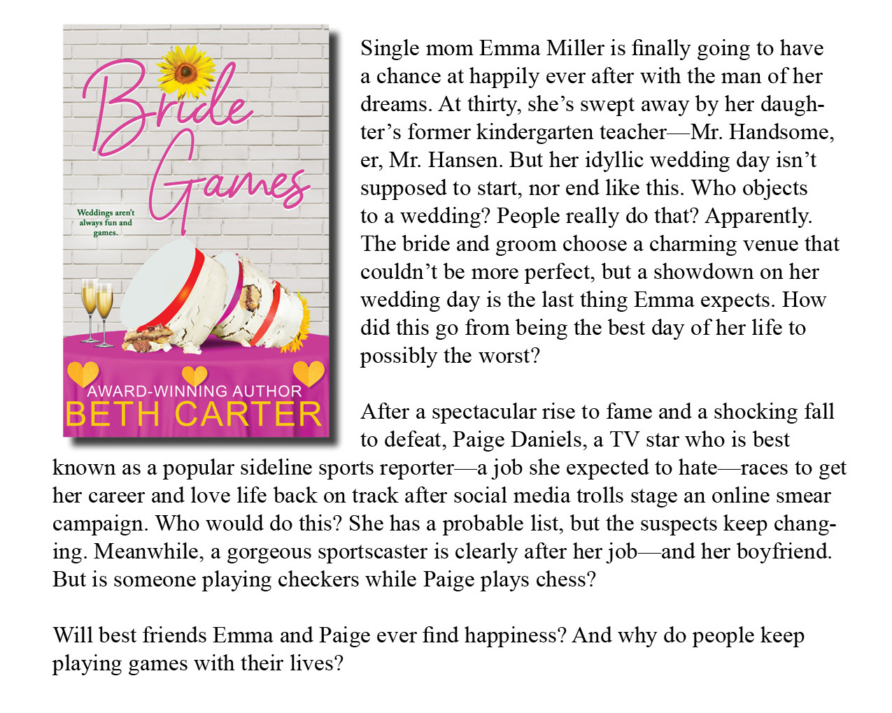 “A blend of romance, friendship, and drama, wrapped in an engaging story about two women navigating life’s unexpected twists. Carter vividly portrays Emma’s emotional rollercoaster, weaving together moments of joy and heartbreak. With humor, emotional depth, and plenty of romantic tension, Bride Games is a captivating read.” ~ Carol T., Readers’ Favorite