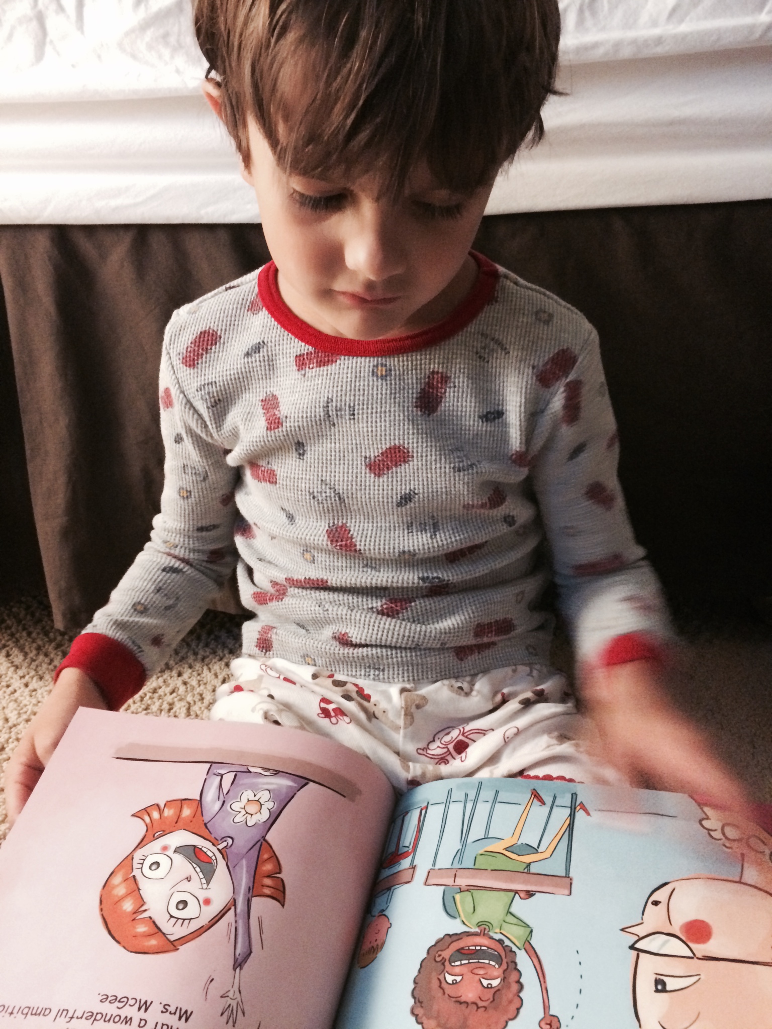 Here’s little Logan reading the inside of WHAT DO YOU WANT TO BE?