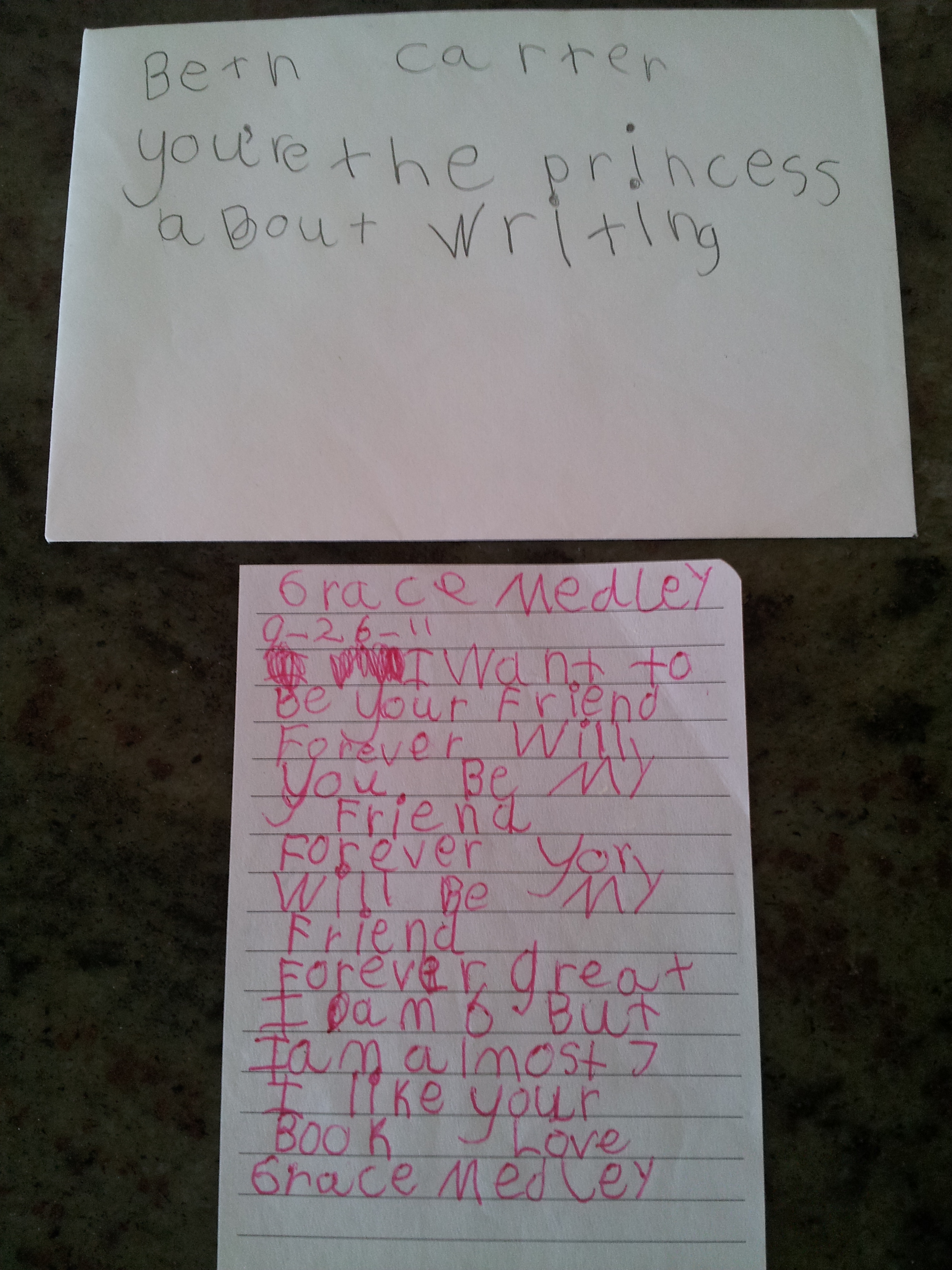 I’ve received several fan letters from children and smile for a week after they arrive. I’ll treasure each and every one. Please keep them coming! Thank you. Here are a few: